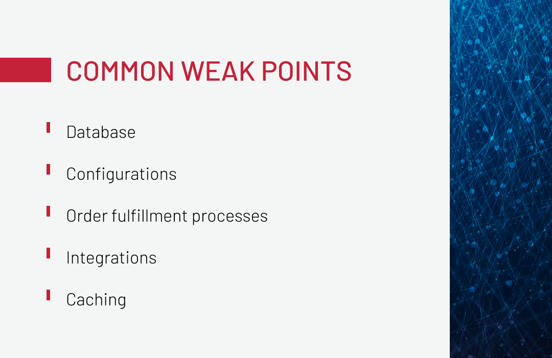 When traffic spikes, problems rarely start with the UI or business logic. They begin in underlying components and become impossible to ignore when thousands of users hit checkout at once. Based on our experience, these are the areas most likely to fail under heavy load — parts of the system that tend to show stress first.