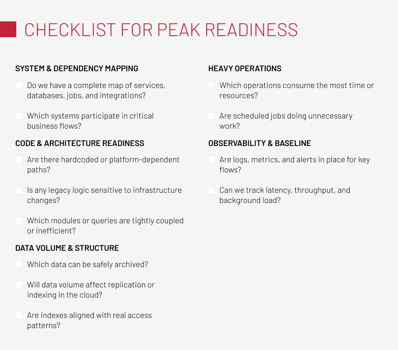 - Have we reviewed legacy logic that could behave unpredictably once infrastructure constraints change?