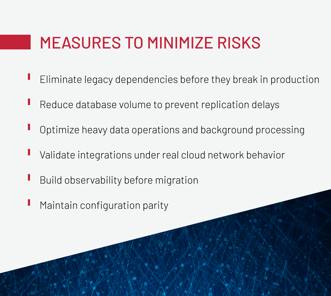 From a technical standpoint, migration is far more stable when the system is prepared for cloud execution patterns in advance. Many performance and consistency issues can be avoided if teams treat this phase as an opportunity to remove brittle logic, reduce data volume, strengthen data integrity, eliminating the number of unknowns that surface during cutover and coexistence. The recommendations below focus on technical measures that limit risk and improve stability as real cloud conditions come into play.