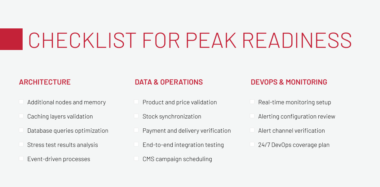 Smooth handling of peak performance doesn’t happen by accident. It comes from the engineering discipline: scaling infrastructure ahead of demand, testing under real conditions, automating recovery paths, and validating data before the first order hits.