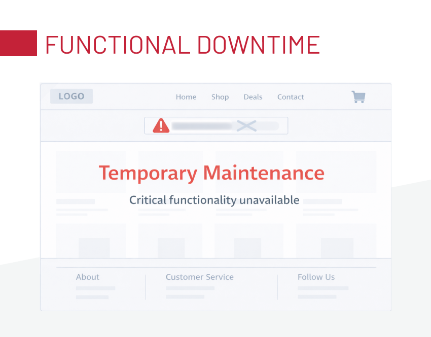 The second category is functional downtime, when critical functionality breaks, but the platform technically runs. For example, when search functionality fails, the business may decide to temporarily create an artificial downtime, rather than leaving end-users to deal with partially working functionality.