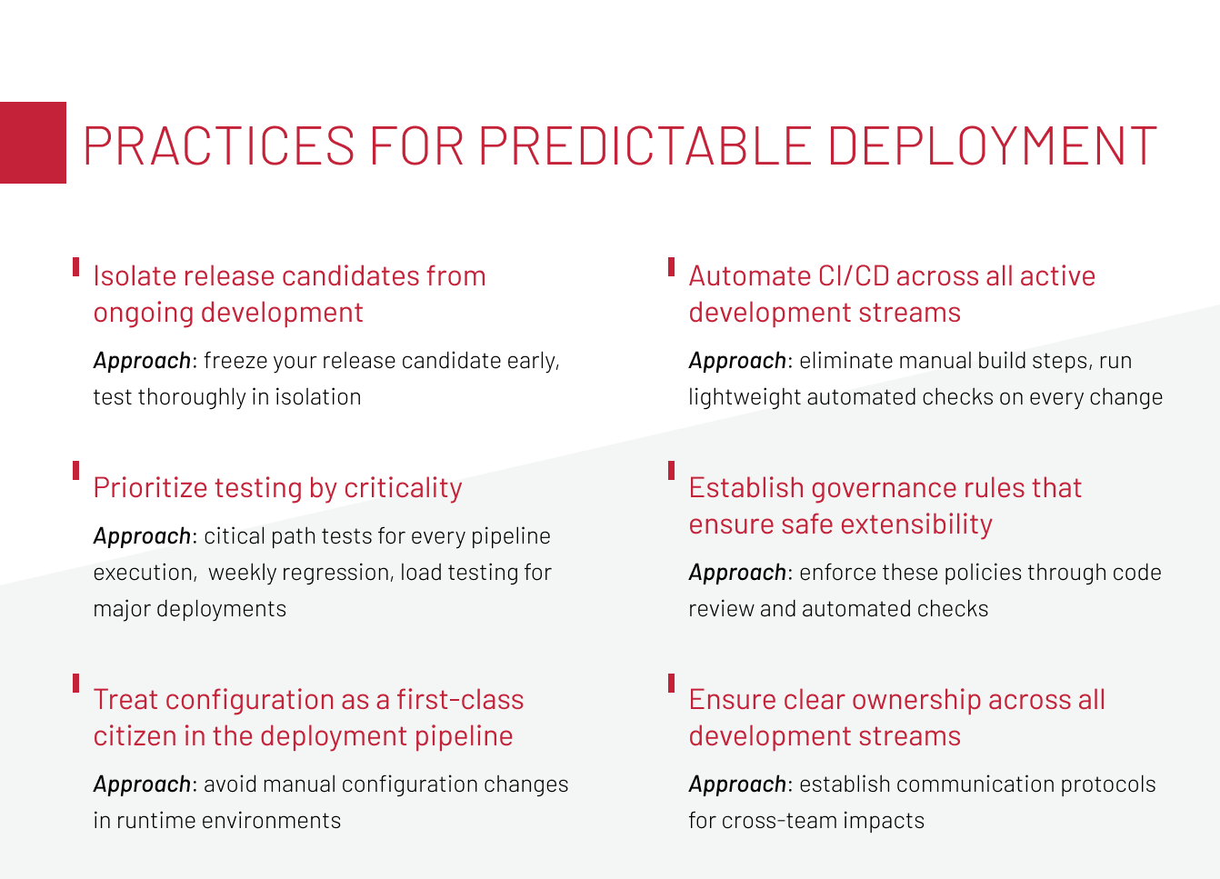 For predictable deployment, every change, regardless of branch, team, or release cycle, must flow through a unified, automated build and test pipeline. This eliminates human error, accelerates feedback loops, and ensures release stability even during high development activity. Automation becomes critical because manual processes simply don’t scale when multiple teams work in parallel or release cycles overlap.